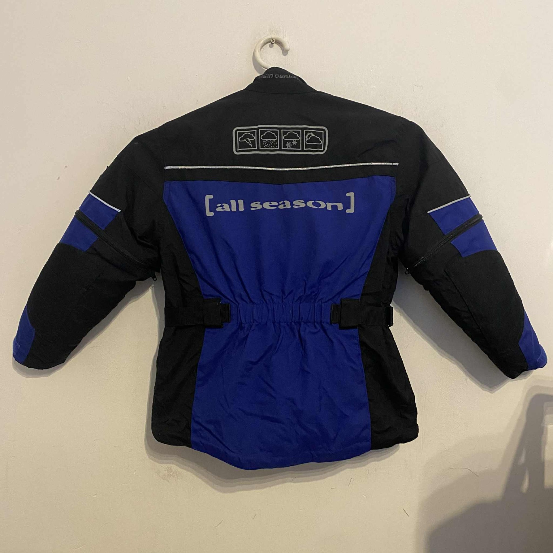 Használt, jó állapotú, könyök és váll protektoros (hátában szivacs) gyerek motoros kabát. Váll 39 cm, mellkas 47 cm, derék max. 46 cm, ujja hossza 46 cm, ami kicipzározva még 2 ujjnyit hosszabítható.